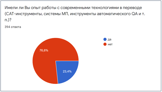 Практические навыки работы с современными технологиями перевода успели приобрести менее четверти опрошенных. Это примерно соответствует доле студентов, уже имеющих опыт работы по специальности. Однако это означает, что в рамках только вузовского обучения технологические умения получены не были: пока студент не устроится на настоящую работу, учиться техническому инструментарию негде.