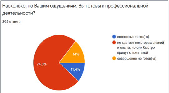 14% студентов чувствуют себя совершенно не готовыми к профессиональной деятельности после вуза, ¾ опрощенных надеются, что необходимые знания и умения быстро придут с практикой.