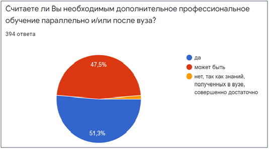 При этом всего 1% респондентов считают, что знаний, полученных в вузе, полностью достаточно в будущей профессии. Остальные 99% с разной долей уверенности полагают, что несмотря на вузовскую подготовку им потребуется еще дополнительное обучение.