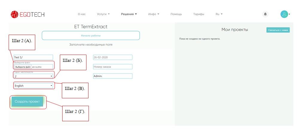 Шаг 2: Создание проекта (поля под "*" обязательны для заполнения):