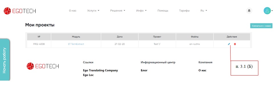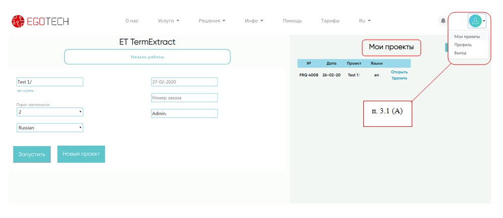 А) Открыть или Удалить проект можно, нажав соответствующую кнопку в поле "Мои проекты", а также из вкладки "Мои проекты" Личного кабинета. (Рис. №3.1.).