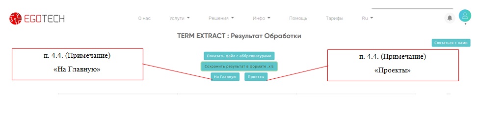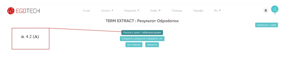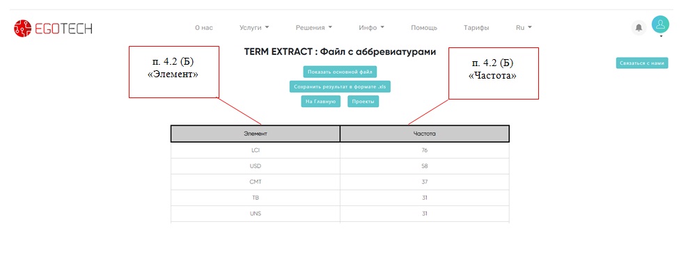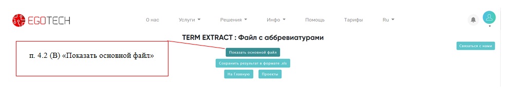 А) ET TermExtract позволяет формировать отдельный список аббревиатур, которые содержаться в анализируемом тексте. Для выгрузки данных нажмите кнопку "Показать файл с аббревиатурами" (Рис. №4.2).