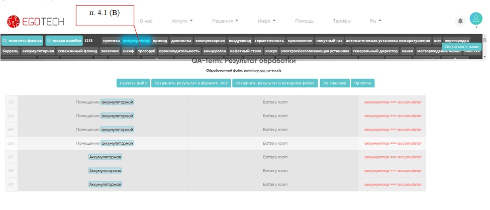 Решение QATerm довольно удобное и применимое в работе переводчика-редактора. Программа позволяет оперативно выявить все неточности перевода (несоответствия терминам из глоссария). Крайне удобна функция «Только ошибки» (позволяет не тратить время на просмотр всего документа), возможность быстрого переключения между терминами с ошибками вверху интерфейса, а также отображение на самом термине общего количества сегментов, в которых выявлены отклонения.